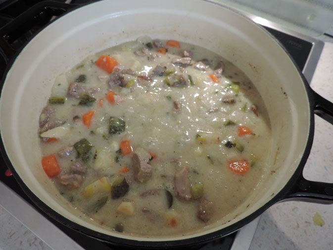 Das Fleisch in 3 cm große Würfeln schneiden, mit Salz und Pfeffer würzen und gut anbraten. Suppengrün und Sellerie in etwa 2 cm große Stücke schneiden, Knoblauchzehe in kleine Würfel schneiden zum Angebratenen dazugeben und mit etwa 300 ml Wasser ablöschen und ca. 45 Minuten kochen.